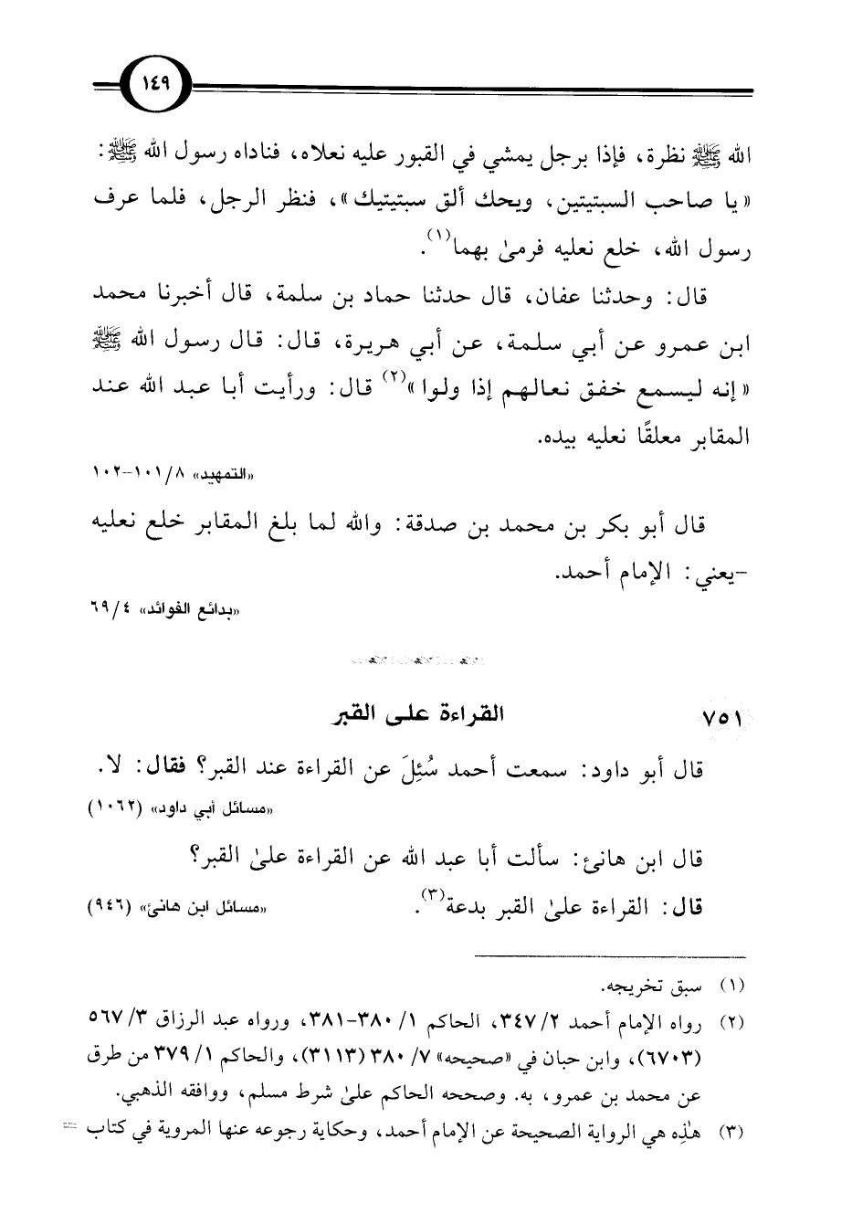 قال: وحدثنا عفان، قال حدثنا حماد بن سلمة، قال أخبرنا محمد ابن عمرو عن أبي سلمة، عن أبي هريرة، قال: قال رسول اللَّه -صلى اللَّه عليه وسلم- "إنه ليسمع خفق نعالهم إذا ولوا" (¬2) قال: ورأيت أبا عبد اللَّه عند المقابر معلقًا نعليه بيده.