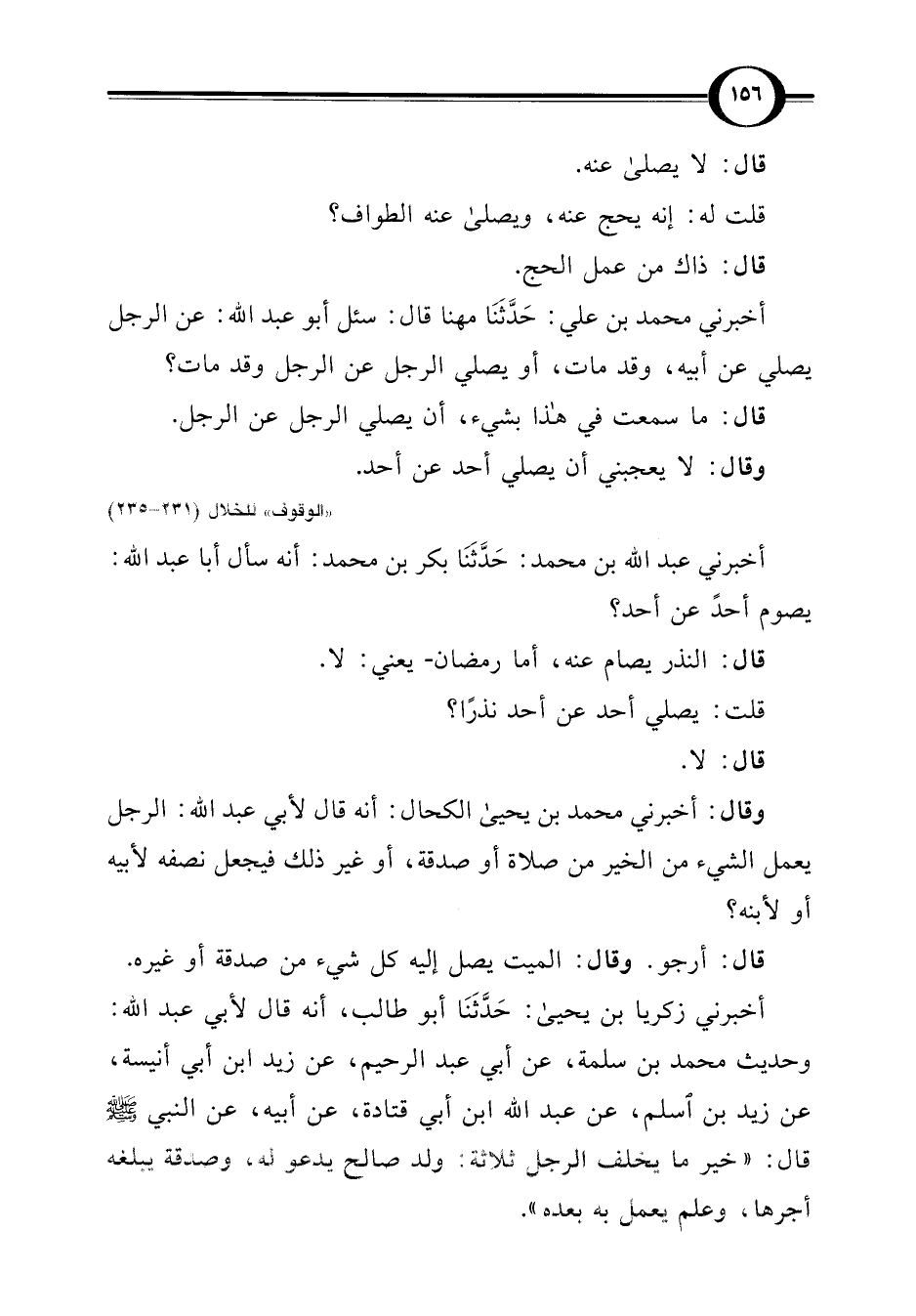 أخبرني محمد بن علي: حَدَّثَنَا مهنا قال: سئل أبو عبد اللَّه: عن الرجل يصلي عن أبيه، وقد مات، أو يصلي الرجل عن الرجل وقد مات؟