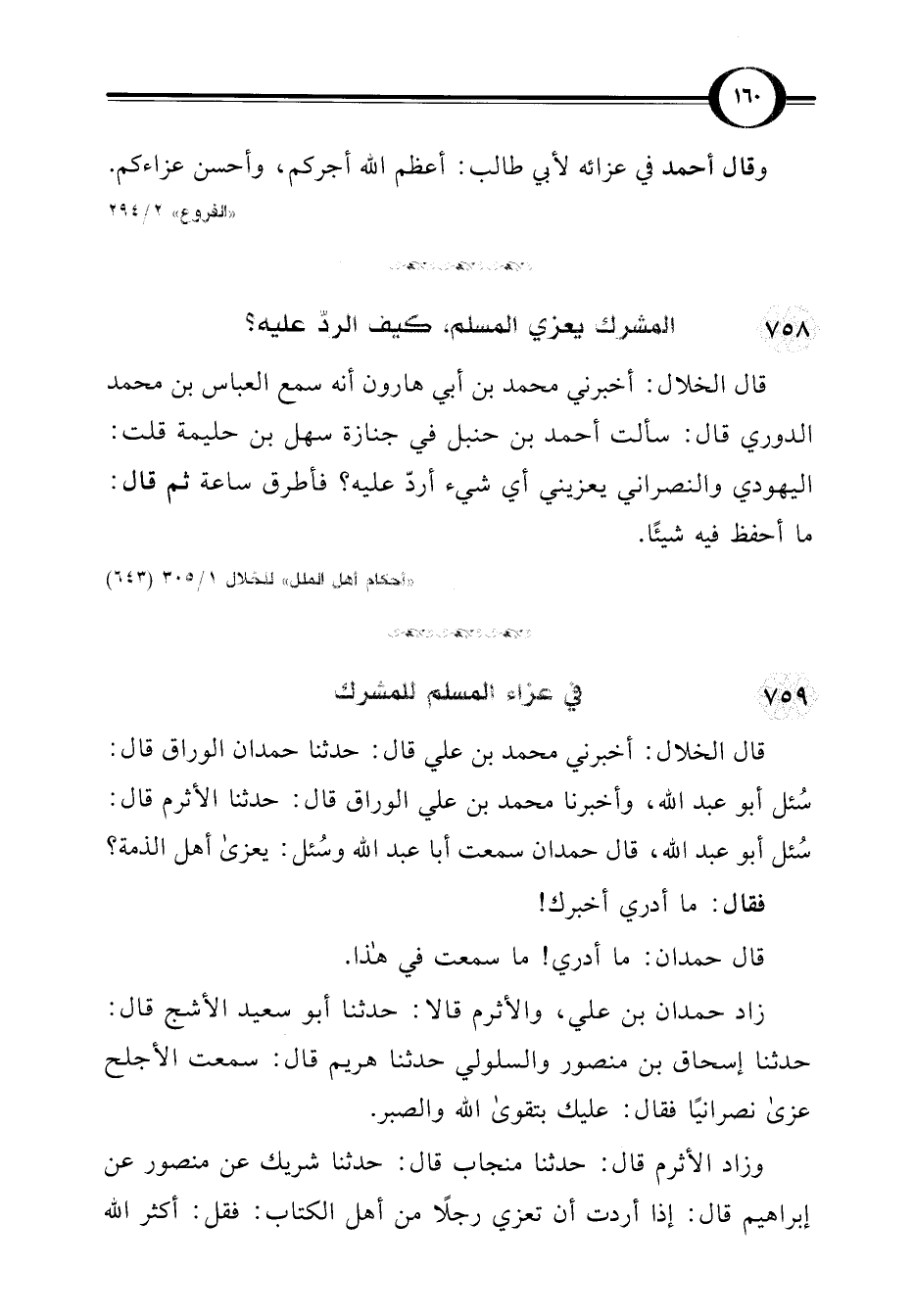 قال الخلال: أخبرني محمد بن علي قال: حدثنا حمدان الوراق قال: سُئل أبو عبد اللَّه، وأخبرنا محمد بن علي الوراق قال: حدثنا الأثرم قال: سُئل أبو عبد اللَّه، قال حمدان سمعت أبا عبد اللَّه وسُئل: يعزى أهل الذمة؟