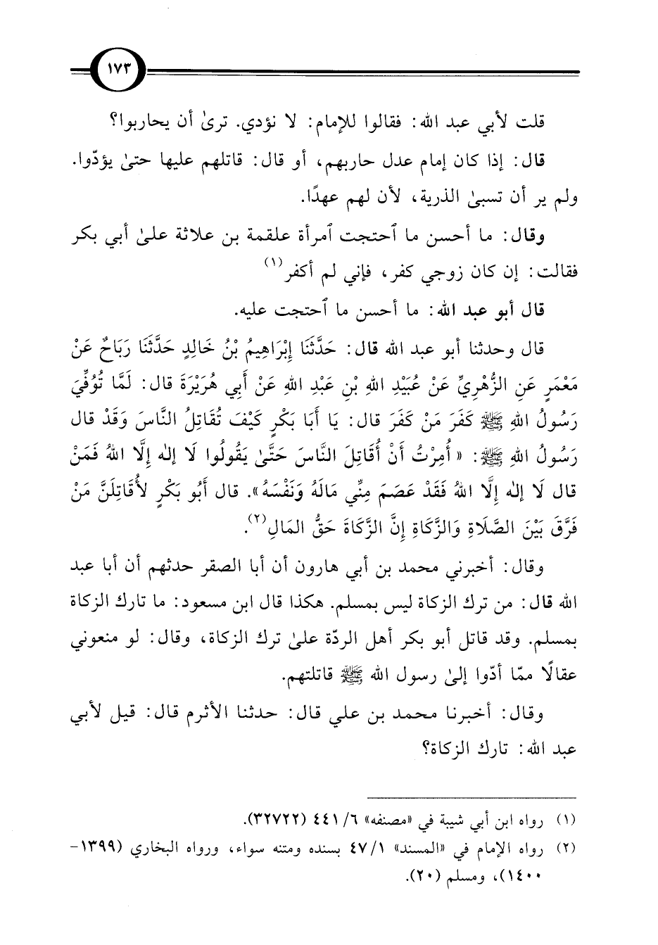 وقال: أخبرني محمد بن أبي هارون أن أبا الصقر حدثهم أن أبا عبد اللَّه قال: من ترك الزكاة ليس بمسلم. هكذا قال ابن مسعود: ما تارك الزكاة بمسلم. وقد قاتل أبو بكر أهل الردّة على ترك الزكاة، وقال: لو منعوني عقالًا ممّا أدّوا إلى رسول اللَّه -صلى اللَّه عليه وسلم- قاتلتهم.