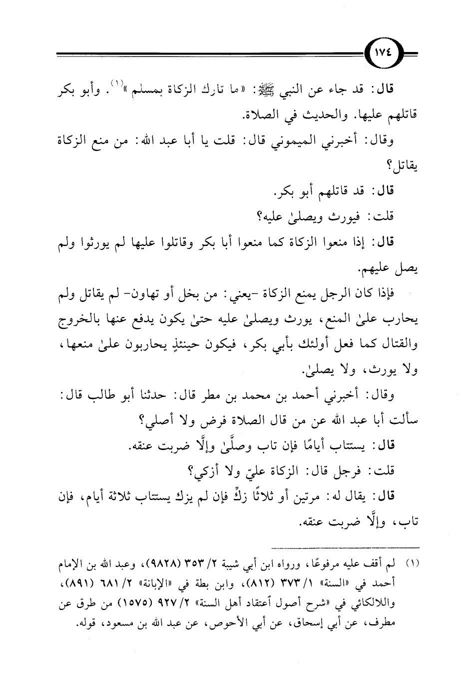 وقال: أخبرني الميموني قال: قلت يا أبا عبد اللَّه: من منع الزكاة يقاتل؟