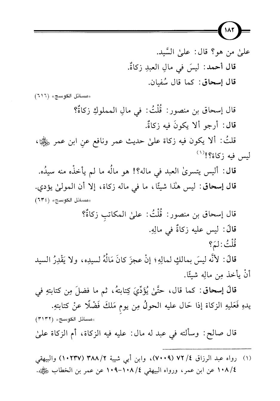 قال إسحاق بن منصور: قُلْتُ: في مالِ المملوكِ زكاةٌ؟
