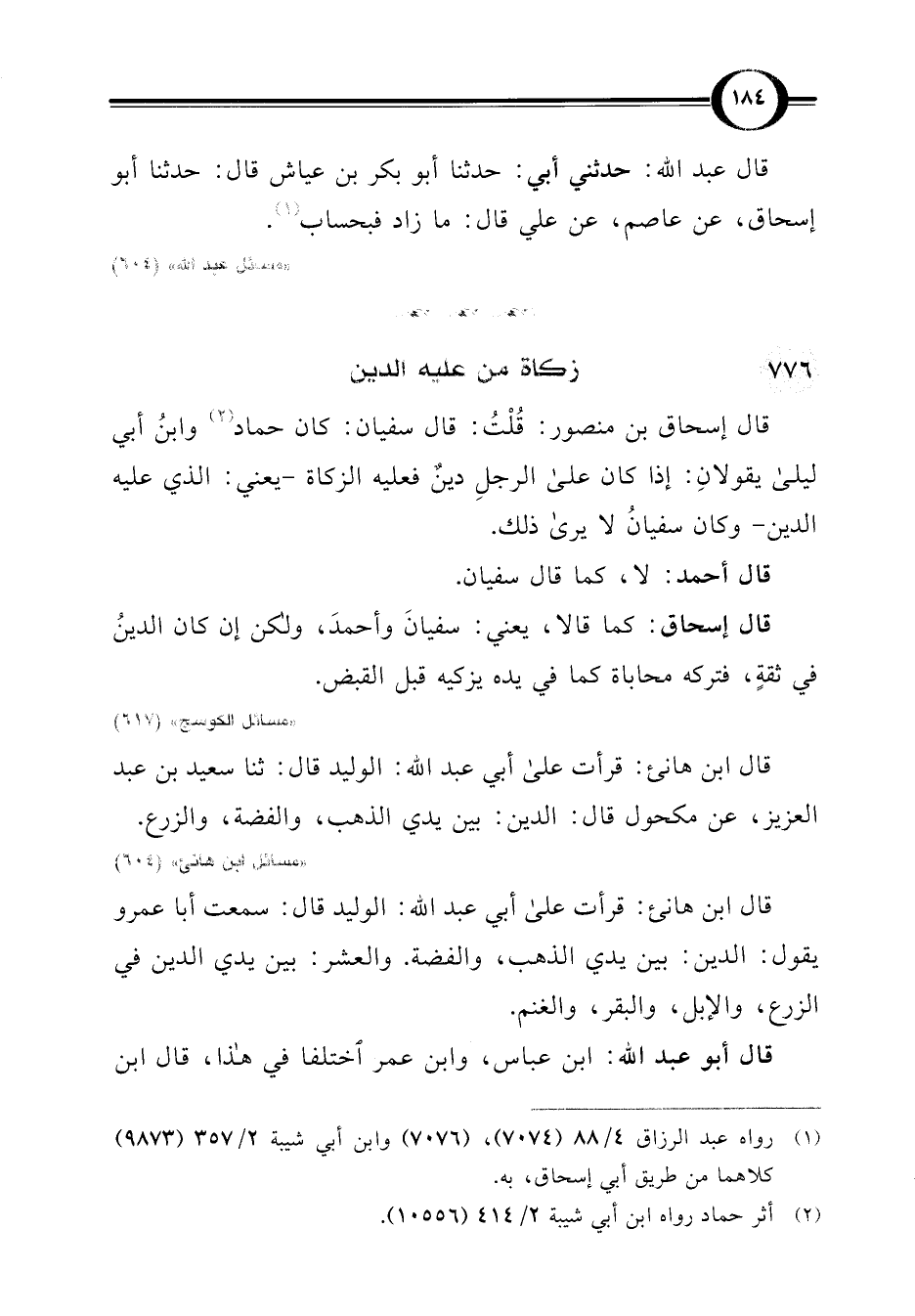 قال إسحاق بن منصور: قُلْتُ: قال سفيان: كان حماد (¬2) وابن أبي ليلى يقولانِ: إذا كان على الرجلِ دين فعليه الزكاة -يعني: الذي عليه الدين- وكان سفيانُ لا يرى ذلك.