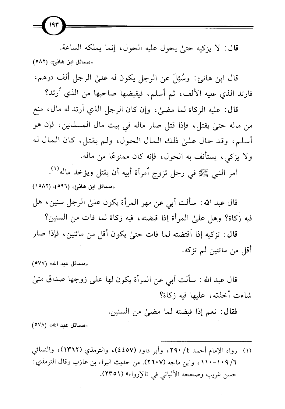 قال عبد اللَّه: سألت أبي عن مهر المرأة يكون على الرجل سنين، هل فيه زكاة؟ وهل على المرأة إذا قبضته، فيه زكاة لما فات من السنين؟