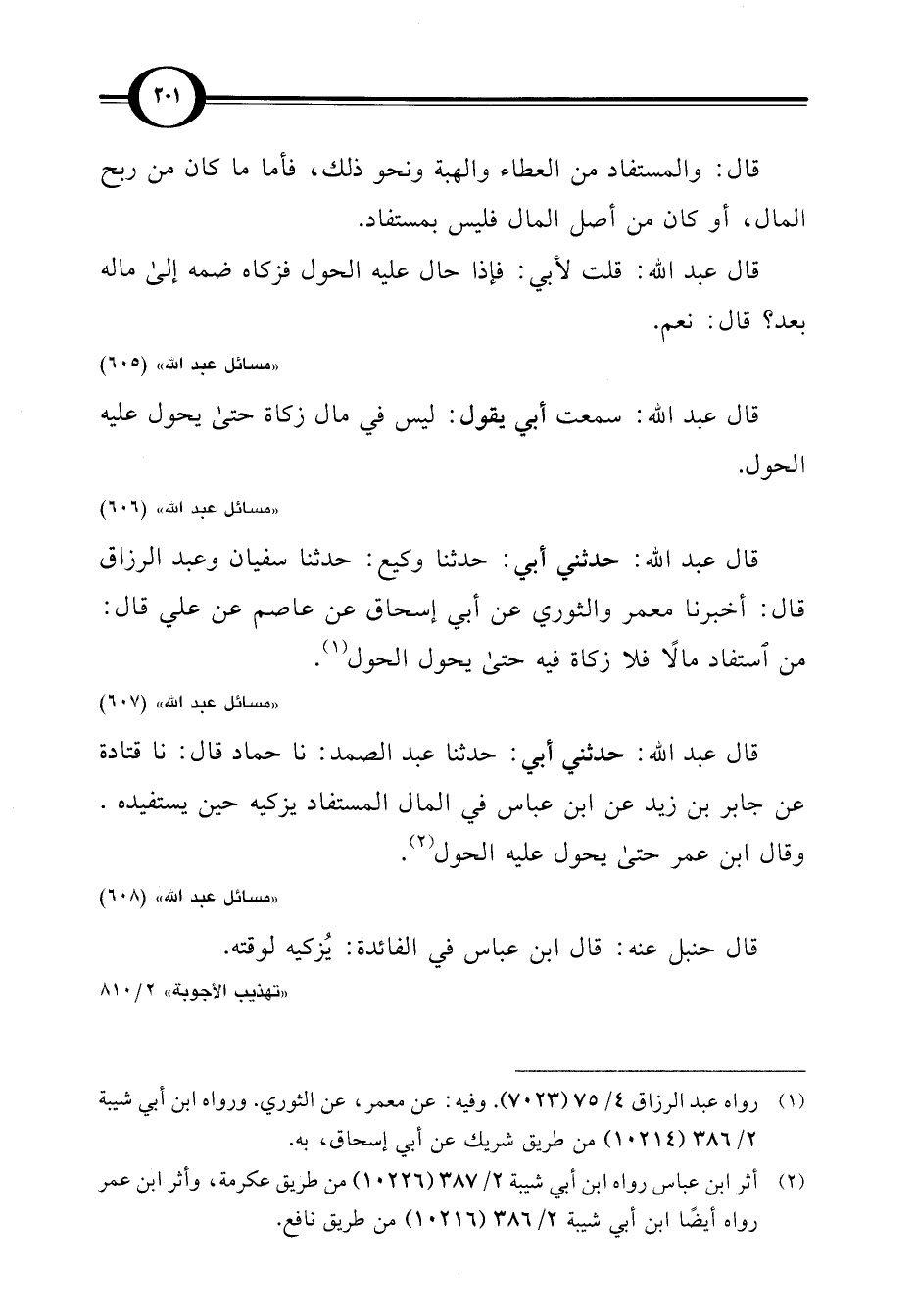 قال عبد اللَّه: حدثني أبي: حدثنا عبد الصمد: نا حماد قال: نا قتادة عن جابر بن زيد عن ابن عباس في المال المستفاد يزكيه حين يستفيده. وقال ابن عمر حتى يحول عليه الحول (¬2).