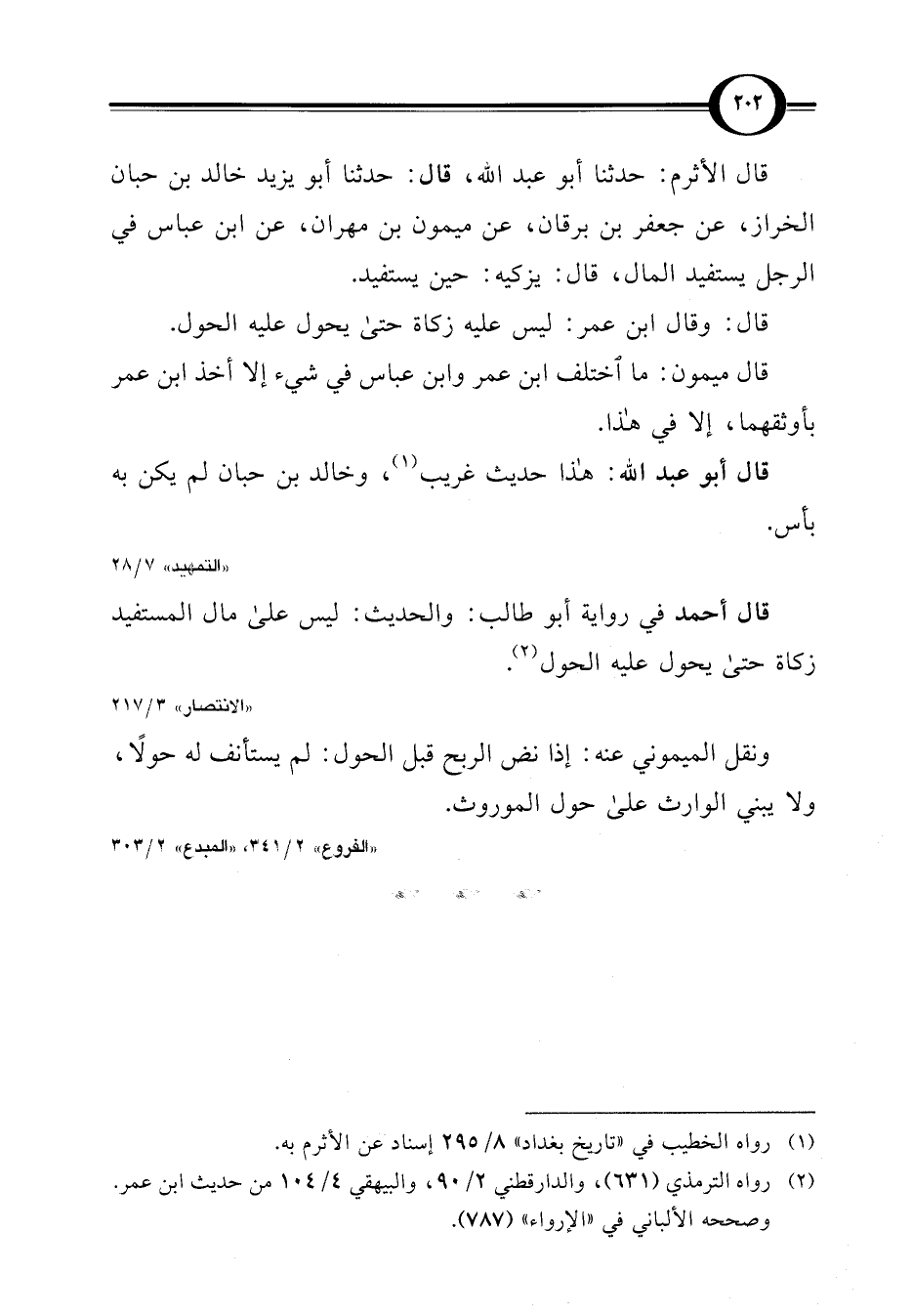 قال الأثرم: حدثنا أبو عبد اللَّه، قال: حدثنا أبو يزيد خالد بن حبان الخراز، عن جعفر بن برقان، عن ميمون بن مهران، عن ابن عباس في الرجل يستفيد المال، قال: يزكيه: حين يستفيد.