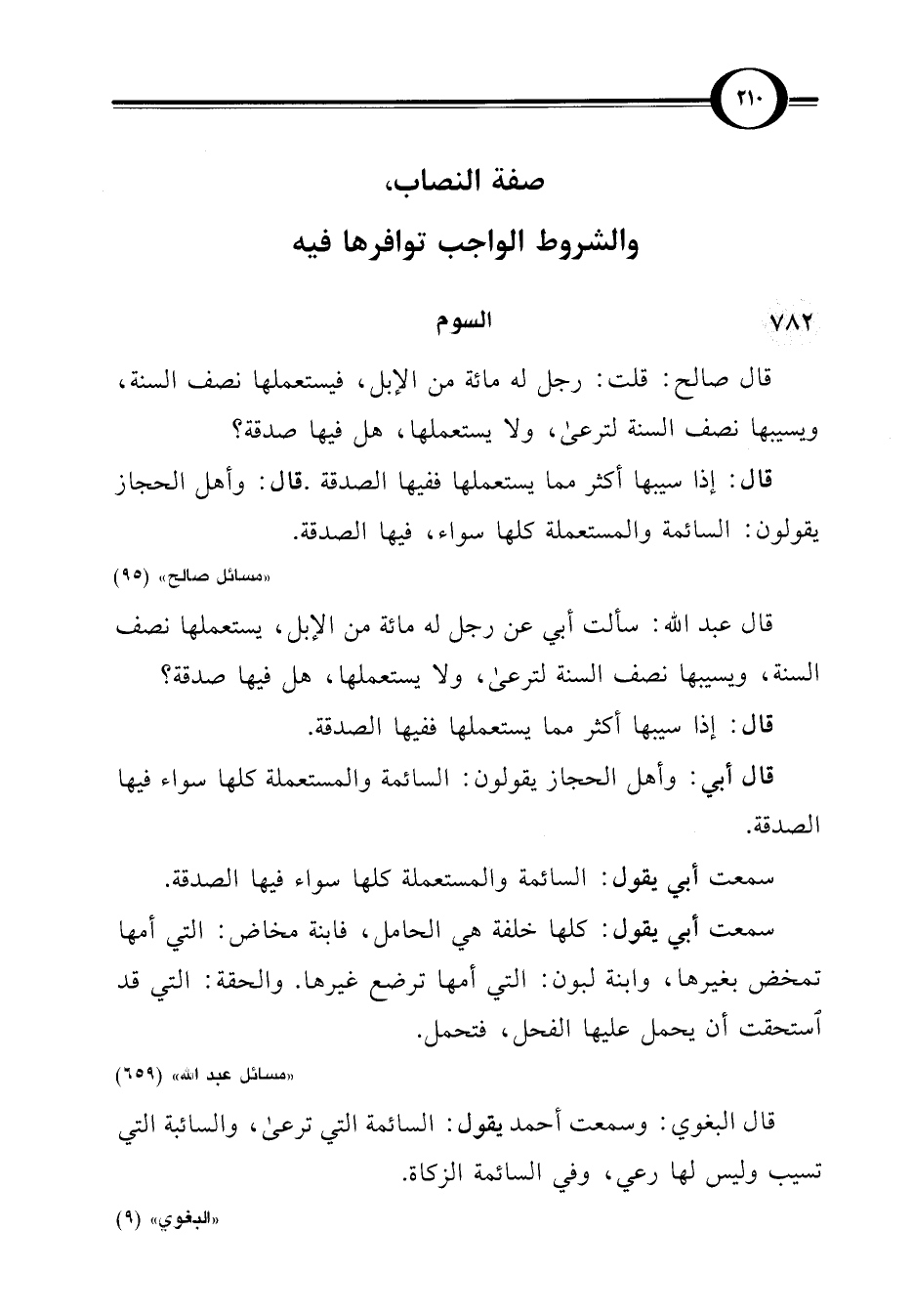 قال صالح: قل: رجل له مائة من الإبل، فيستعملها نصف السنة، ويسيبها نصف السنة لمرعى، ولا يستعملها، هل فيها صدقة؟