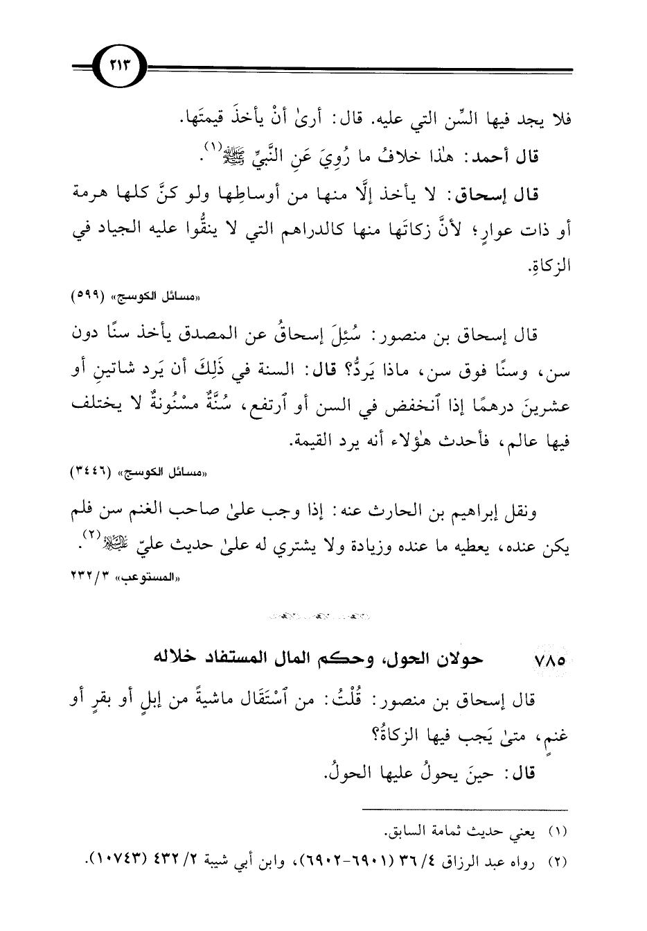 قال إسحاق بن منصور: سُئِلَ إسحاقُ عن المصدق يأخذ سنًا دون سن، وسنًا فوق سن، ماذا يَردُّ؟ قال: السنة في ذَلِكَ أن يَرد شاتينِ أو عشرينَ درهمًا إذا انخفض في السن أو ارتفع، سُنَّة مسْنُونةٌ لا يختلف فيها عالم، فأحدث هؤلاء أنه يرد القيمة.