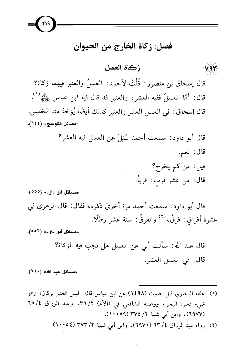 قال أبو داود: سمعت أحمد سُئِلَ عن العسل فيه العشر؟