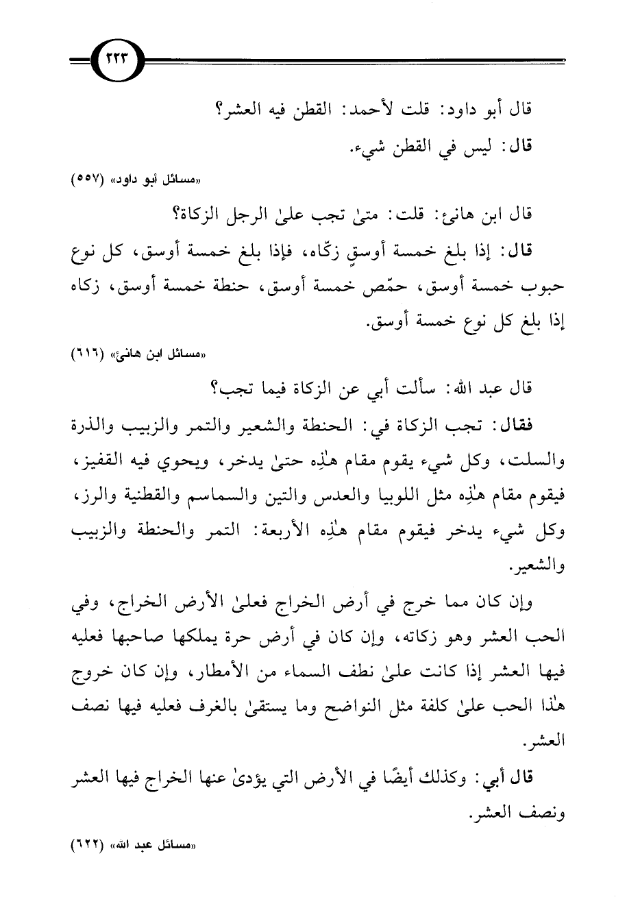 قال عبد اللَّه: سألت أبي عن الزكاة فيما تجب؟