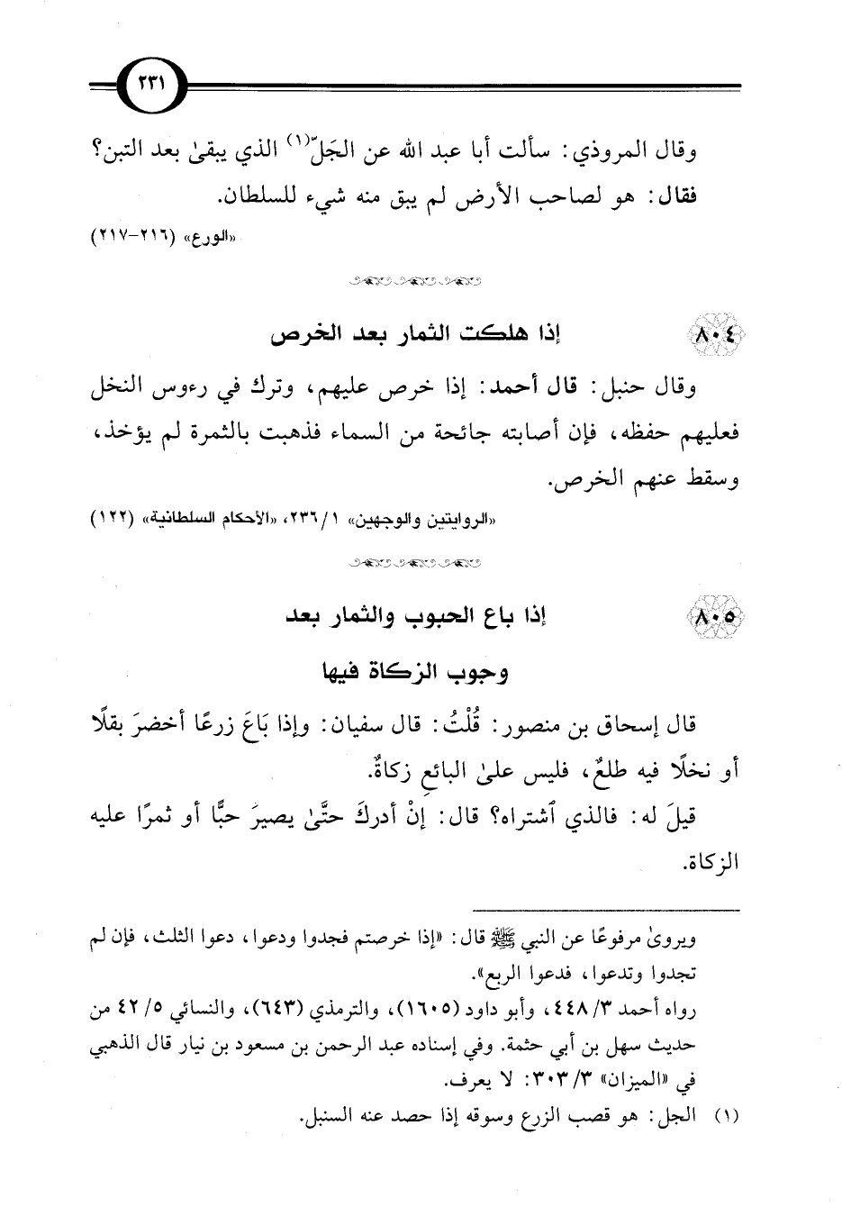 قال إسحاق بن منصور: قُلْتُ: قال سفيان: وإذا بَاعَ زرعًا أخضرَ بقلًا أو نخلًا فيه طلعٌ، فليس على البائعِ زكاةٌ.