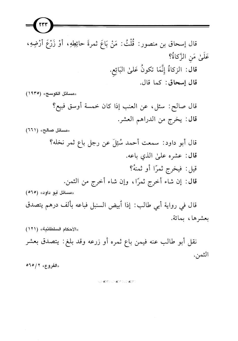 قال إسحاق بن منصور: قُلْتُ: مَنْ بَاعَ ثمرةَ حائِطِهِ، أوْ زَرْعَ أرْضِهِ، الزَكاة؟
