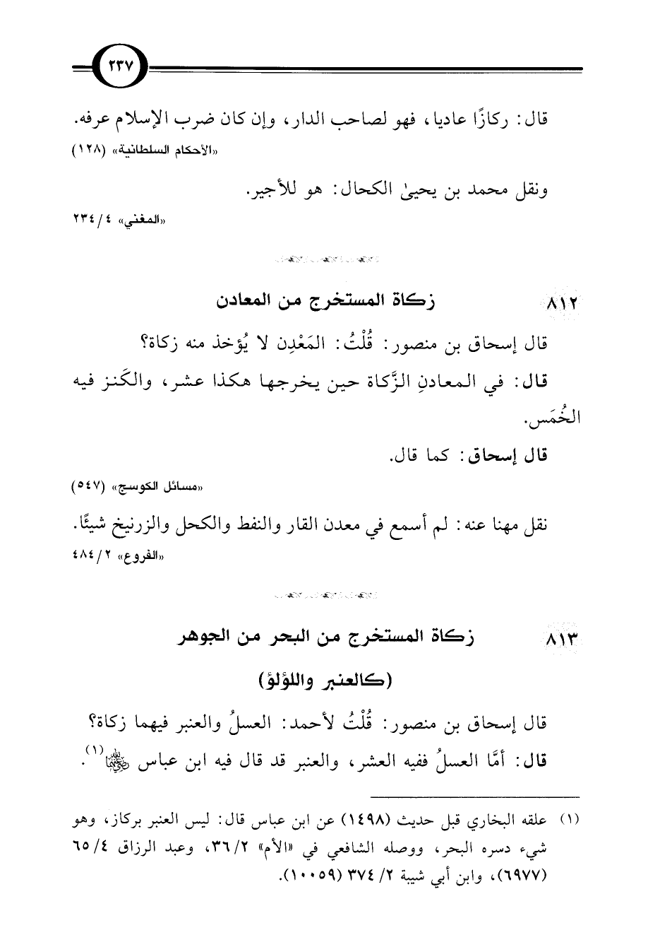 قال إسحاق بن منصور: قُلْتُ: المَعْدِن لا يُؤخذ منه زكاة؟