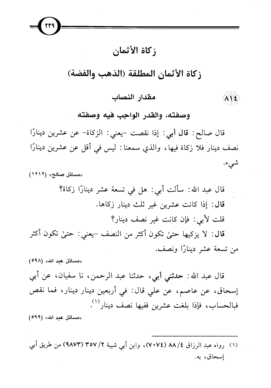 قال صالح: قال أبي: إذا نقصت -يعني: الزكاة- عن عشرين دينارًا نصف دينار فلا زكاة فيها، والذي سمعنا: ليس في أقل عن عشرين دينارًا شيء.