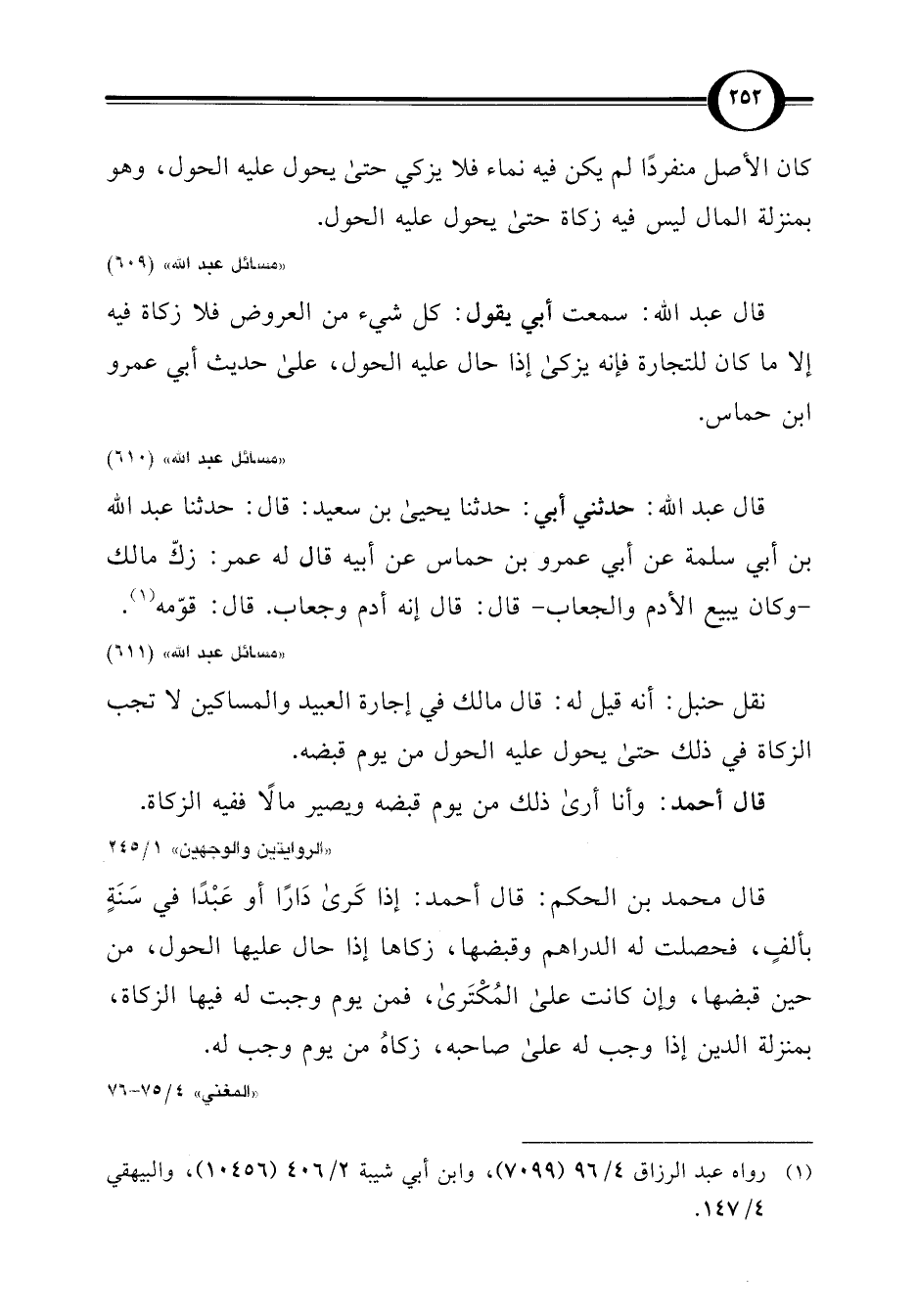 قال عبد اللَّه: سمعت أبي يقول: كل شيء من العروض فلا زكاة فيه إلا ما كان للتجارة فإنه يزكى إذا حال عليه الحول، على حديث أبي عمرو ابن حماس.