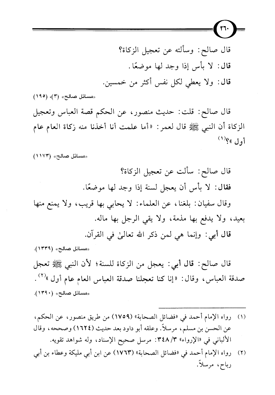 قال صالح: وسألته عن تعجيل الزكاة؟