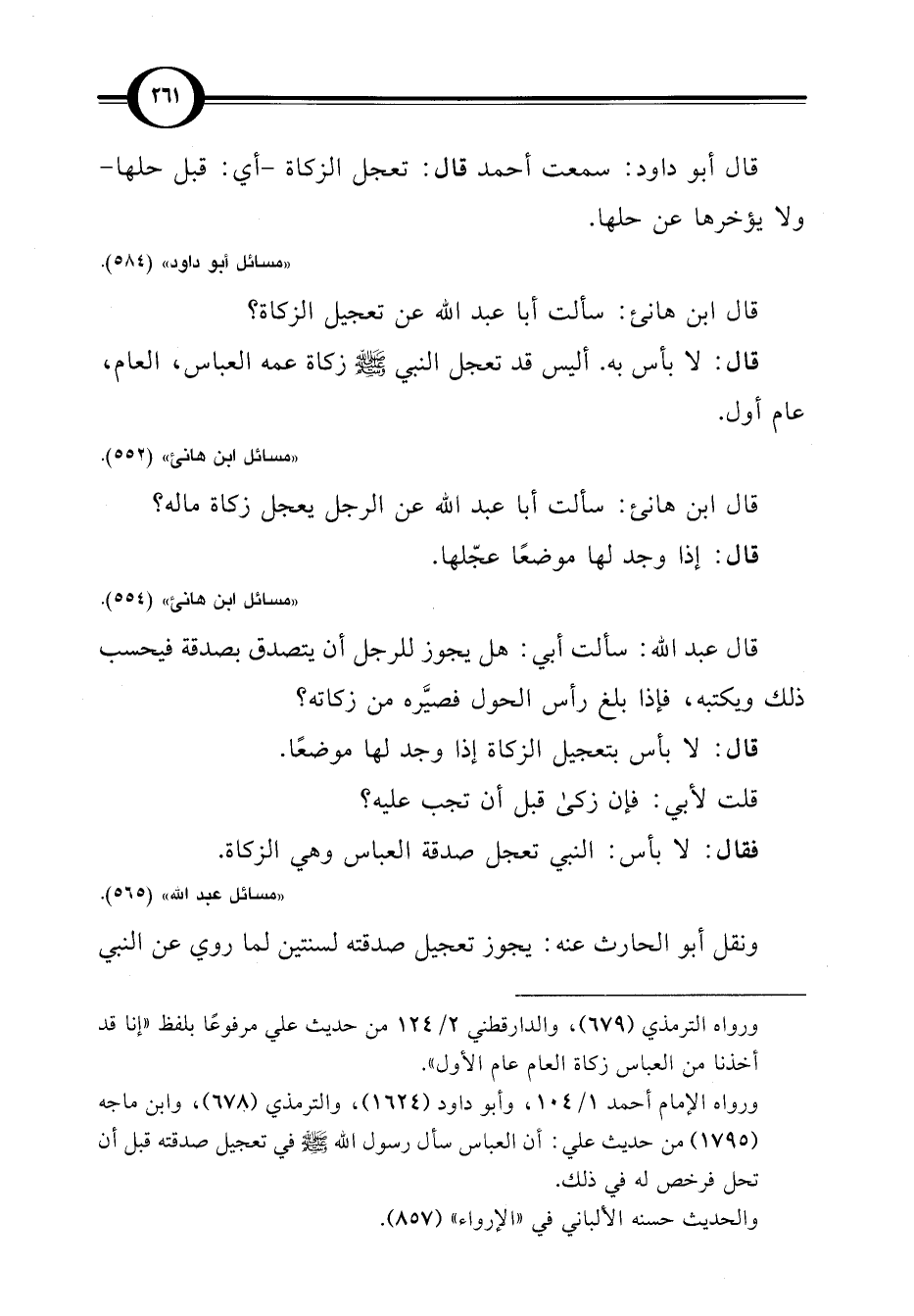 قال أبو داود: سمعت أحمد قال: تعجل الزكاة -أي: قبل حلها- ولا يؤخرها عن حلها.