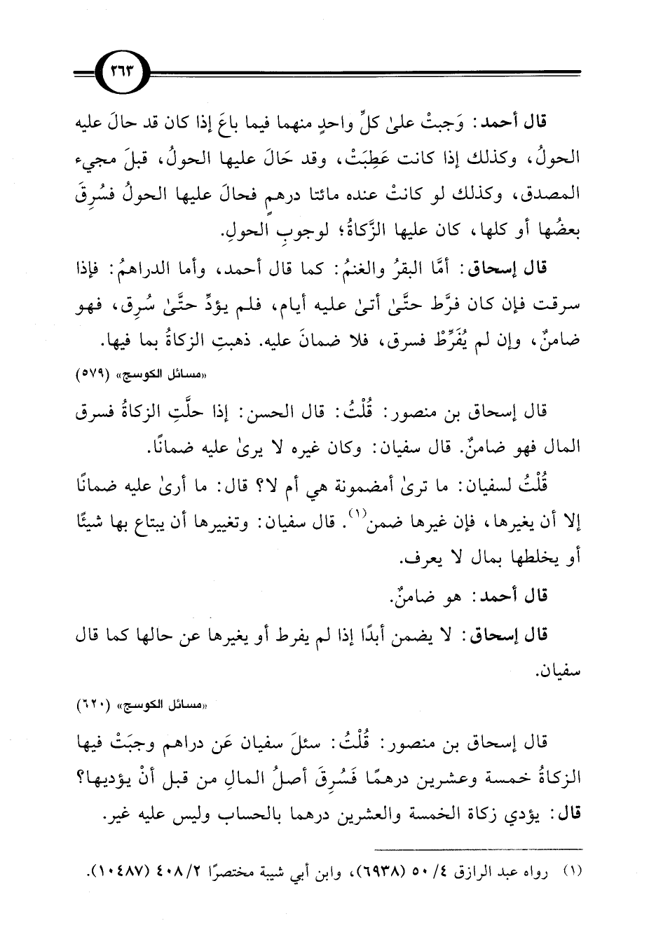 قال إسحاق بن منصور: قُلْتُ: قال الحسن: إذا حلَّتِ الزكاةُ فسرق المال فهو ضامن. قال سفيان: وكان غيره لا يرى عليه ضمانًا.