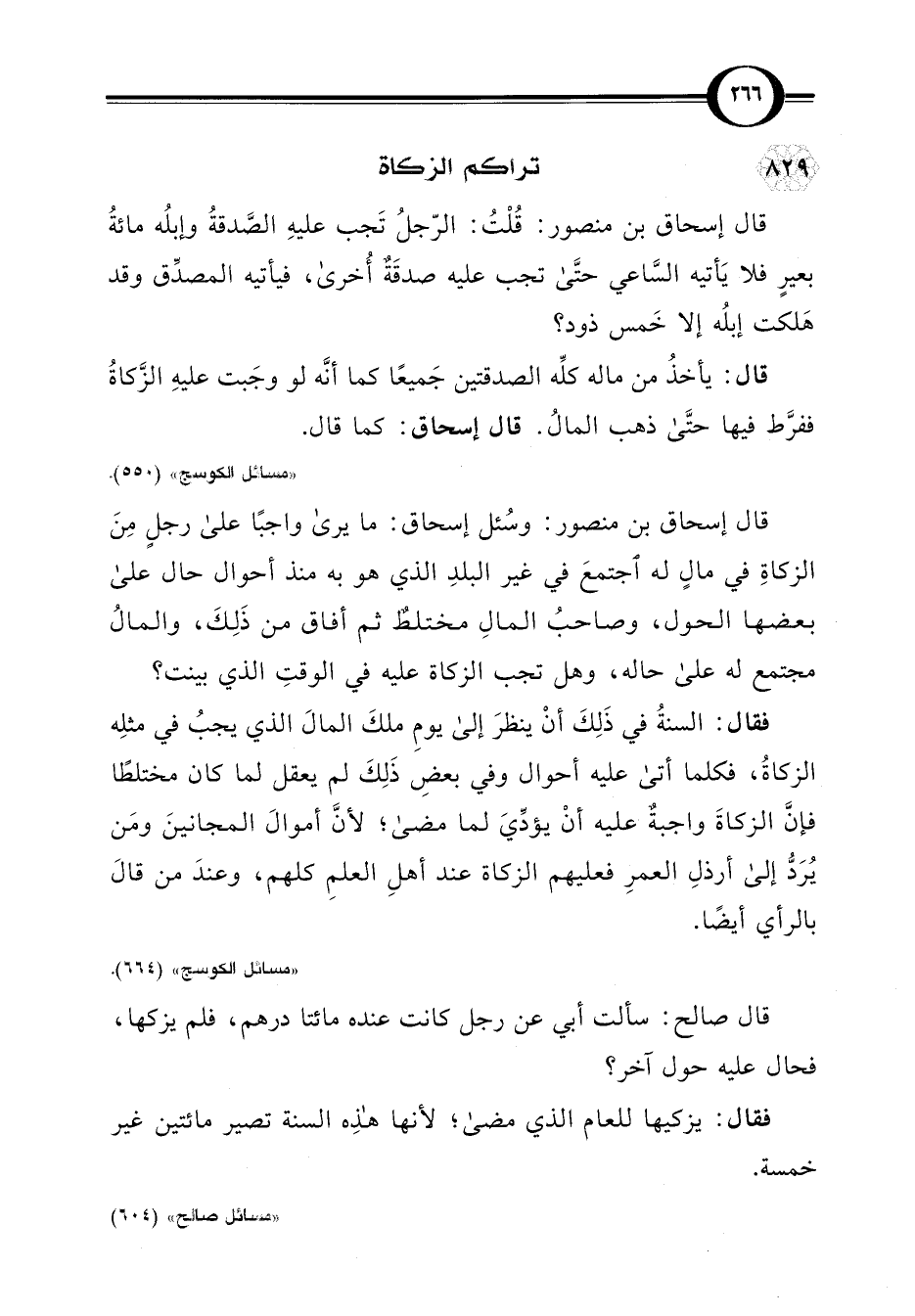 قال إسحاق بن منصور: وسُئل إسحاق: ما يرى واجبًا على رجلٍ مِنَ الزكاةِ في مال له اجتمعَ في غير البلدِ الذي هو به منذ أحوال حال على بعضها الحول، وصاحبُ المالِ مختلطٌ ثم أفاق من ذَلِكَ، والمالُ مجتمع له على حاله، وهل تجب الزكاة عليه في الوقتِ الذي بينت؟