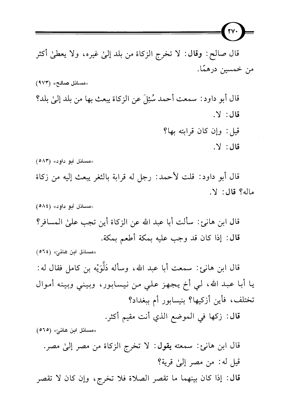 قال ابن هانئ: سمعت أبا عبد اللَّه، وسأله دَلَّوَيْه بن كامل فقال له: يا أبا عبد اللَّه، لي أخ يجهز علي من نيسابور، وبيني وبينه أموال تختلف، فأين أزكيها؟ بنيسابور أم ببغداد؟