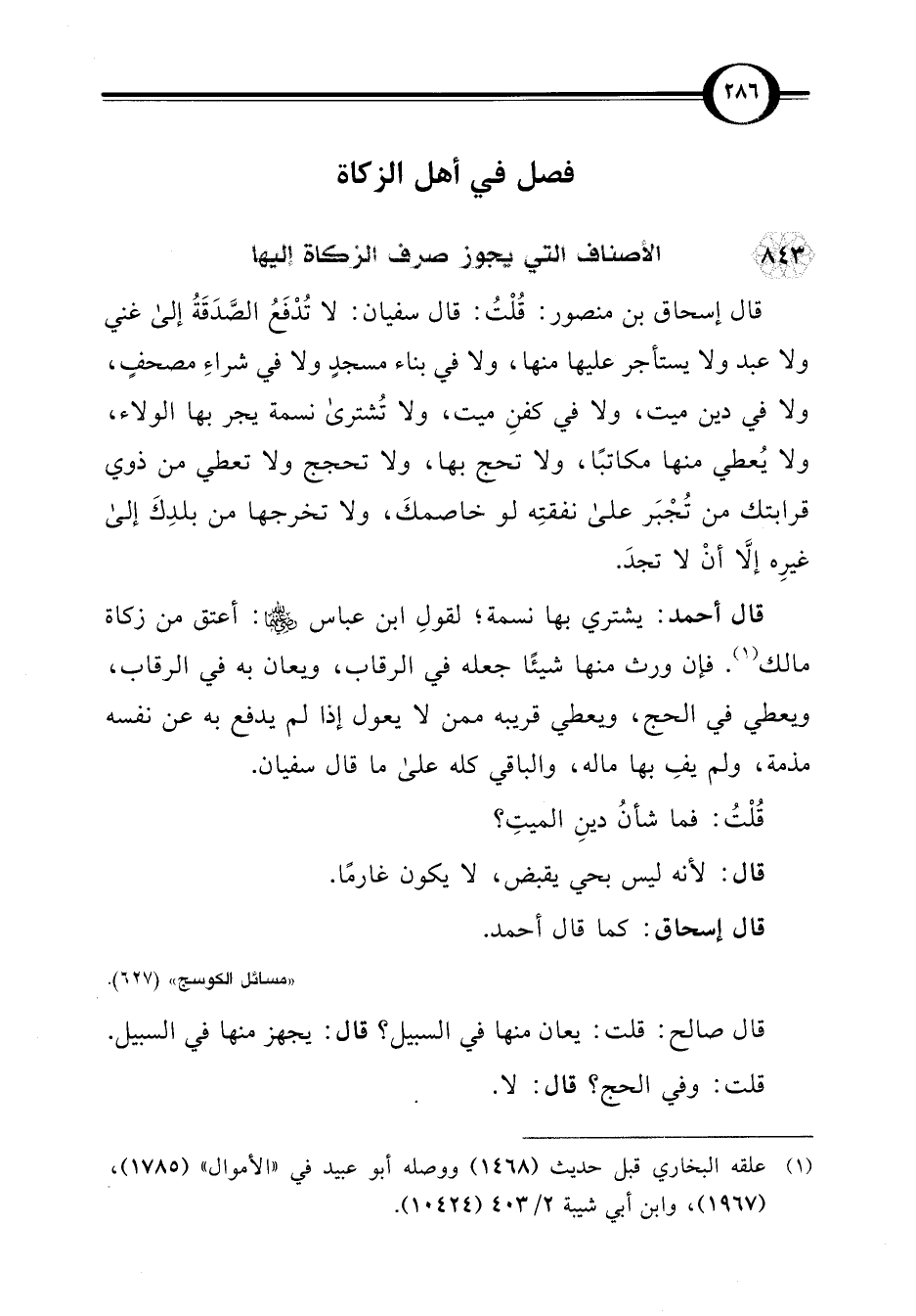 قال إسحاق بن منصور: قُلْتُ: قال سفيان: لا تُدْفَعُ الصَّدَقَةُ إلى غني ولا عبد ولا يستأجر عليها منها، ولا في بناء مسجدٍ ولا في شراءِ مصحفٍ، ولا في دين ميت، ولا في كفنِ ميت، ولا تُشترى نسمة يجر بها الولاء، ولا يُعطي منها مكاتبًا، ولا تحج بها، ولا تحجج ولا تعطي من ذوي قرابتك من تُجْبَر على نفقتِه لو خاصمكَ، ولا تخرجها من بلدِكَ إلى غيرِه إلَّا أنْ لا تجدَ.