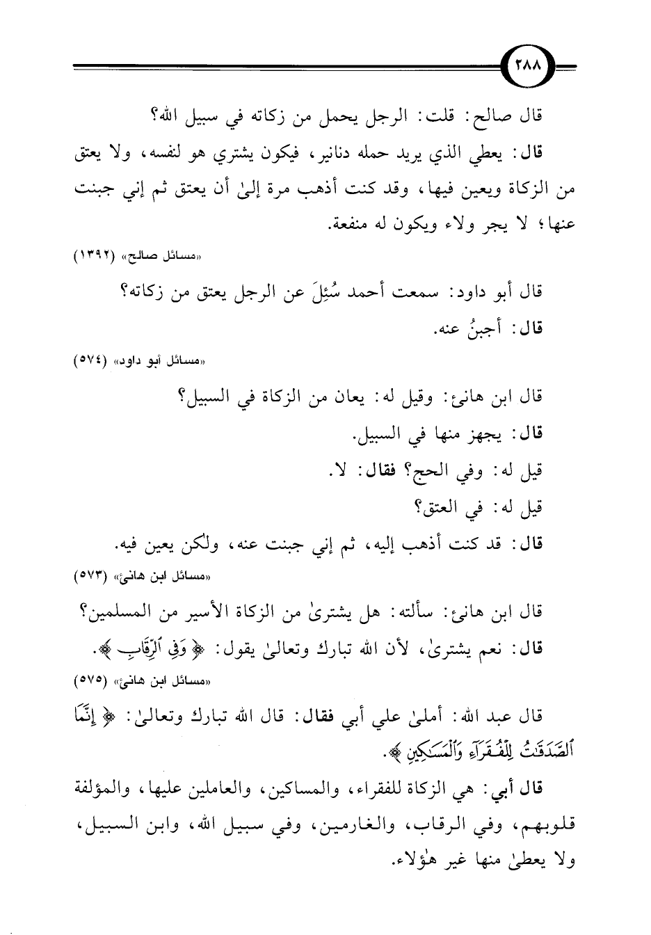 قال ابن هانئ: وقيل له: يعان من الزكاة في السبيل؟