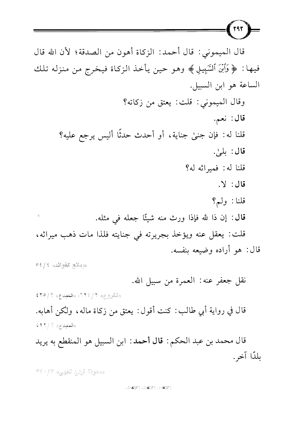 قال محمد بن عبد الحكم: قال أحمد: ابن السبيل هو المنقطع به يريد بلدًا آخر.