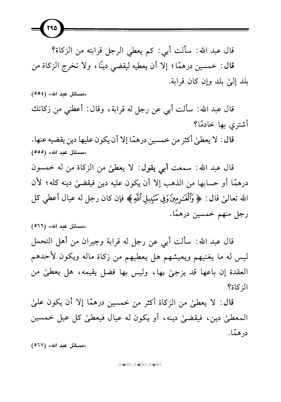 قال عبد اللَّه: سمعت أبي يقول: لا يعطى من الزكاة من له خمسون درهمًا أو حسابها من الذهب إلا أن يكون عليه دين فيقضى دينه كله؛ لأن اللَّه تعالى قال: {وَالْغَارِمِينَ وَفِي سَبِيلِ اللَّهِ} فإن كان رجل له عيال أعطي كل رجل منهم خمسين درهمًا.