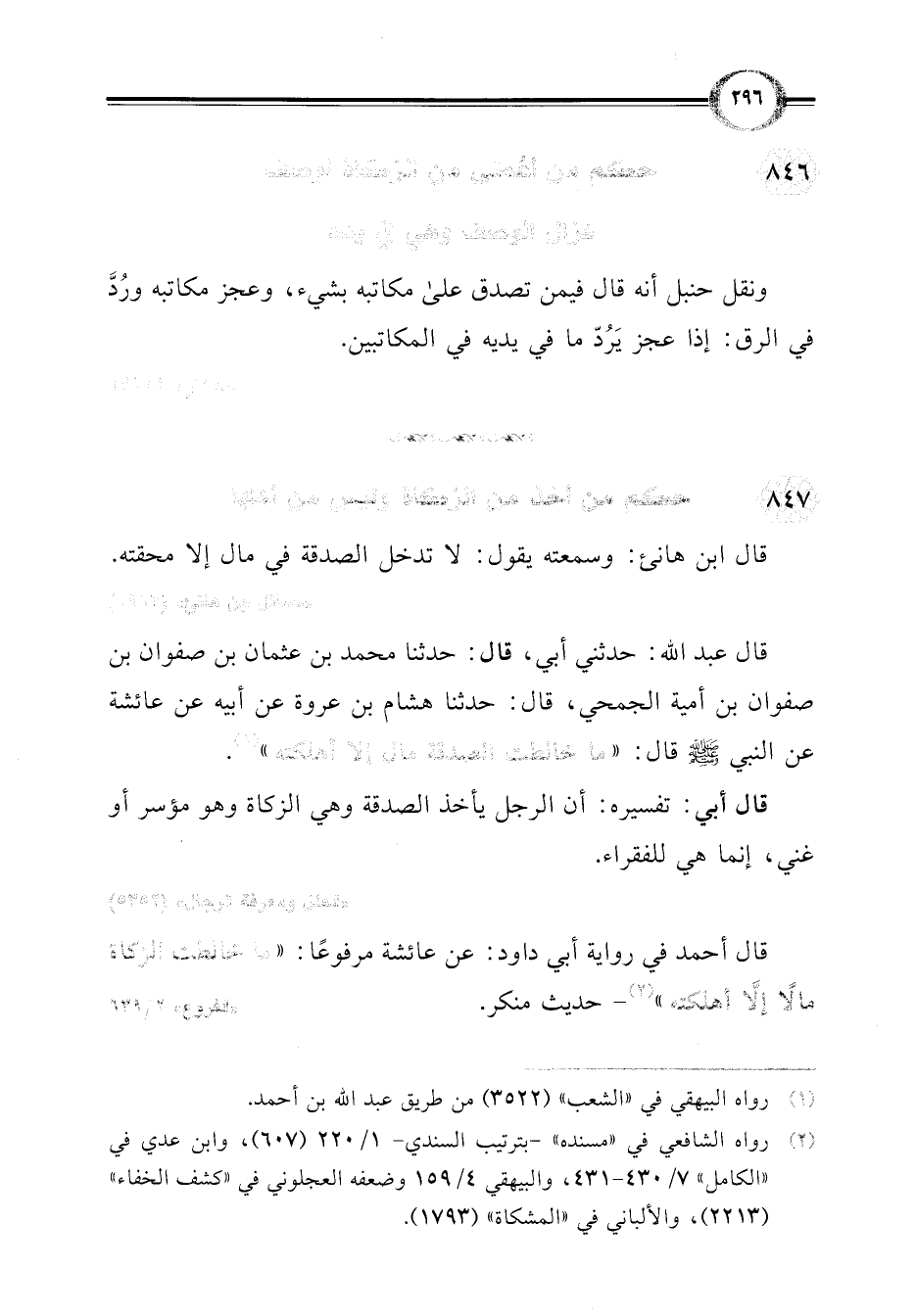 قال عبد اللَّه: حدثني أبي، قال: حدثنا محمد بن عثمان بن صفوان بن صفوان بن أمية الجمحي، قال: حدثنا هشام بن عروة عن أبيه عن عائشة عن النبي -صلى اللَّه عليه وسلم- قال: "ما خالطت الصدقة مال إلا أهلكته" (¬1).