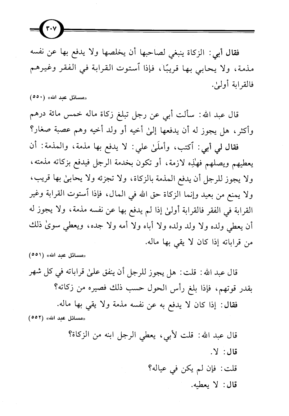 قال عبد اللَّه: سألت أبي عن رجل تبلغ زكاة ماله خمس مائة درهم وأكثر، هل يجوز له أن يدفعها إلى أخيه أو ولد أخيه وهم عصبة صغار؟