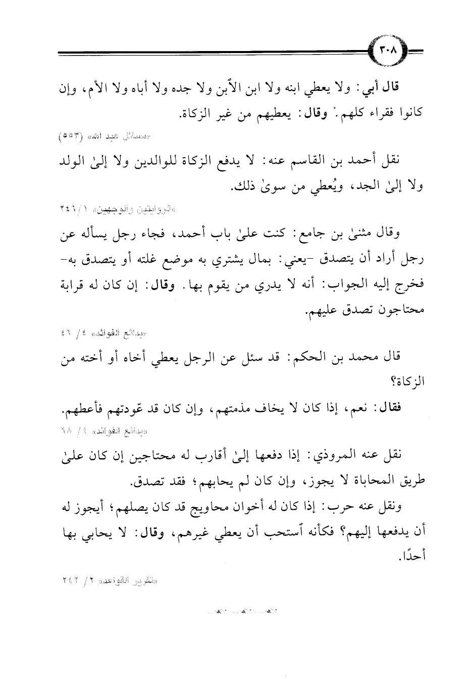 ونقل عنه حرب: إذا كان له أخوان محاويج قد كان يصلهم؛ أيجوز له أن يدفعها إليهم؟ فكأنه استحب أن يعطي غيرهم، وقال: لا يحابي بها أحدًا.