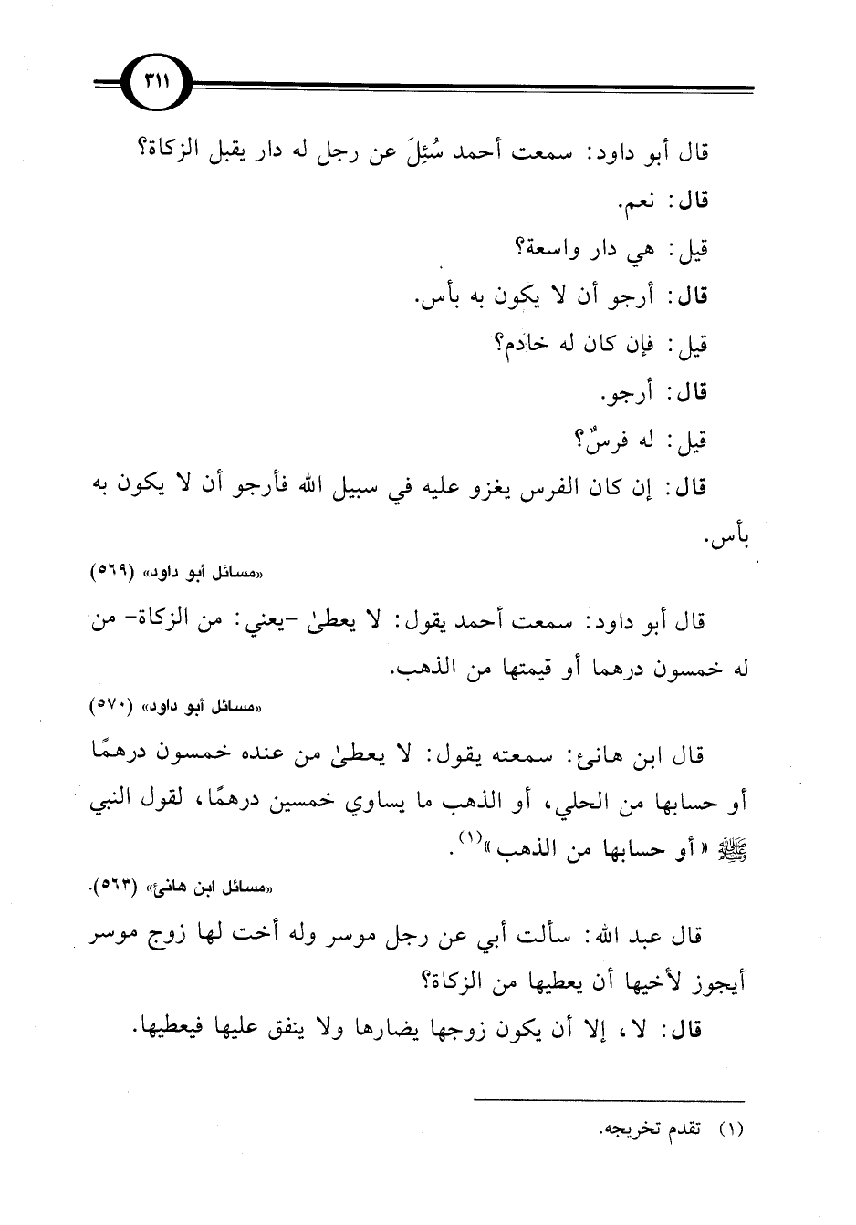 قال أبو داود: سمعت أحمد يقول: لا يعطى -يعني: من الزكاة- من له خمسون درهما أو قيمتها من الذهب.