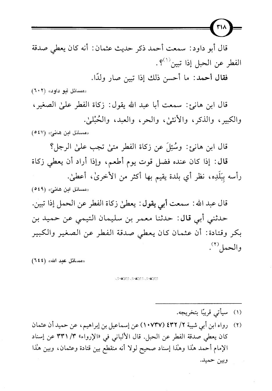 (¬2) رواه ابن أبي شيبة 2/ 432 (10737) عن إسماعيل بن إبراهيم، عن حميد أن عثمان كان يعطي صدقة الفطر عن الحبل. قال الألباني في "الإرواء" 3/ 331 عن إسناد الإمام أحمد هذا وهذا إسناد صحيح لولا أنه منقطع بين قتادة وعثمان، وبين هذا وبين حميد.