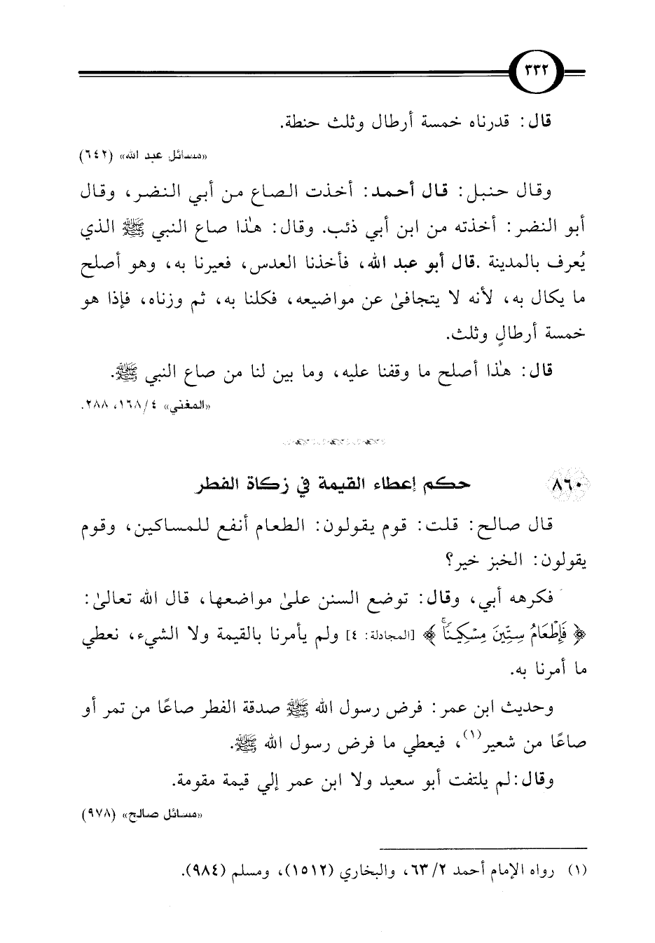 وقال حنبل: قال أحمد: أخذت الصاع من أبي النضر، وقال أبو النضر: أخذته من ابن أبي ذئب. وقال: هذا صاع النبي -صلى اللَّه عليه وسلم- الذي يُعرف بالمدينة. قال أبو عبد اللَّه، فأخذنا العدس، فعيرنا به، وهو أصلح ما يكال به، لأنه لا يتجافى عن مواضيعه، فكلنا به، ثم وزناه، فإذا هو خمسة أرطالٍ وثلث.