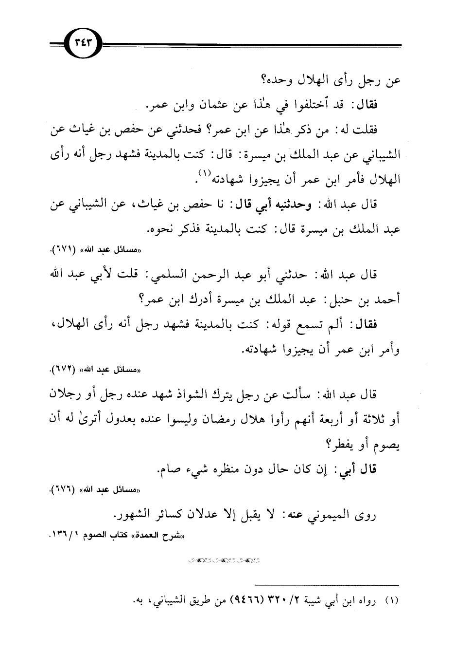 فقلت له: من ذكر هذا عن ابن عمر؟ فحدثني عن حفص بن غياث عن الشيباني عن عبد الملك بن ميسرة: قال: كنت بالمدينة فشهد رجل أنه رأى الهلال فأمر ابن عمر أن يجيزوا شهادته (¬1).