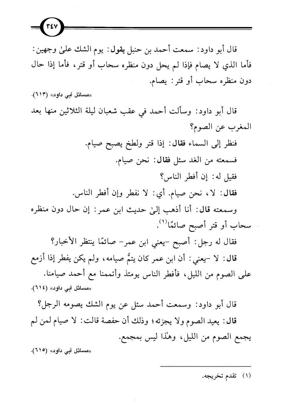 قال أبو داود: سمعت أحمد بن حنبل يقول: يوم الشك على وجهين: فأما الذي لا يصام فإذا لم يحل دون منظره سحاب أو قتر، فأما إذا حال دون منظره سحاب أو قتر: يصام.