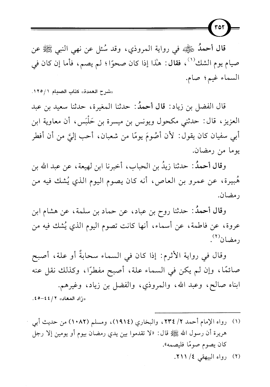 وقال أحمدُ: حدثنا روح بن عباد، عن حماد بن سلمة، عن هشام ابن عروة، عن فاطمة، عن أسماء، أنها كانت تصوم اليوم الذي يُشك فيه من رمضان (¬2).