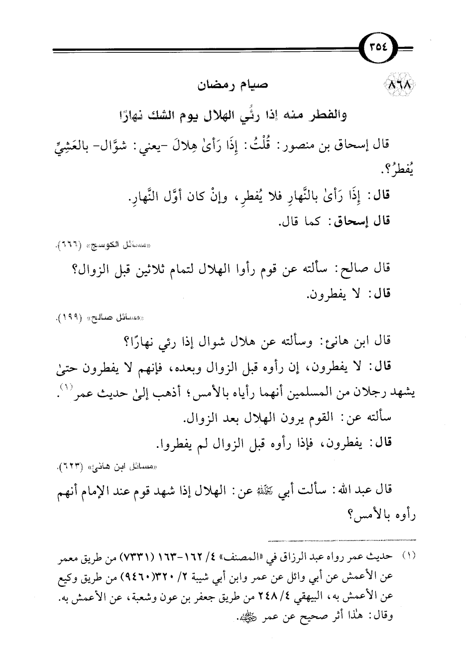 قال عبد اللَّه: سألت أبي رحمه اللَّه عن: الهلال إذا شهد قوم عند الإمام أنهم رأوه بالأمس؟