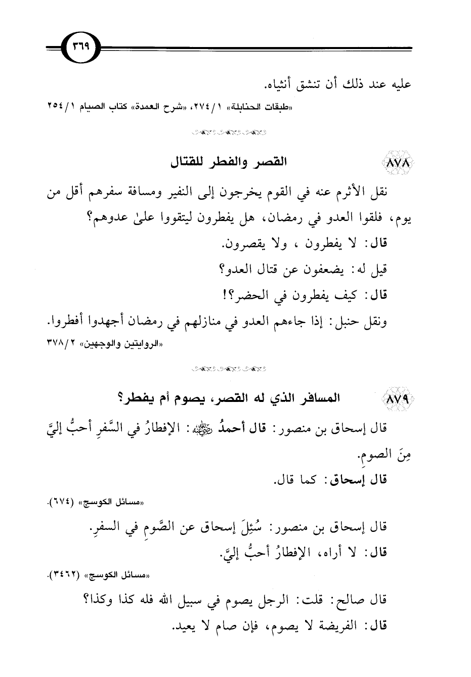 قال إسحاق بن منصور: قال أحمدُ -رضي اللَّه عنه-: الإفطارُ في السَّفرِ أحبُّ إليَّ مِنَ الصومِ.