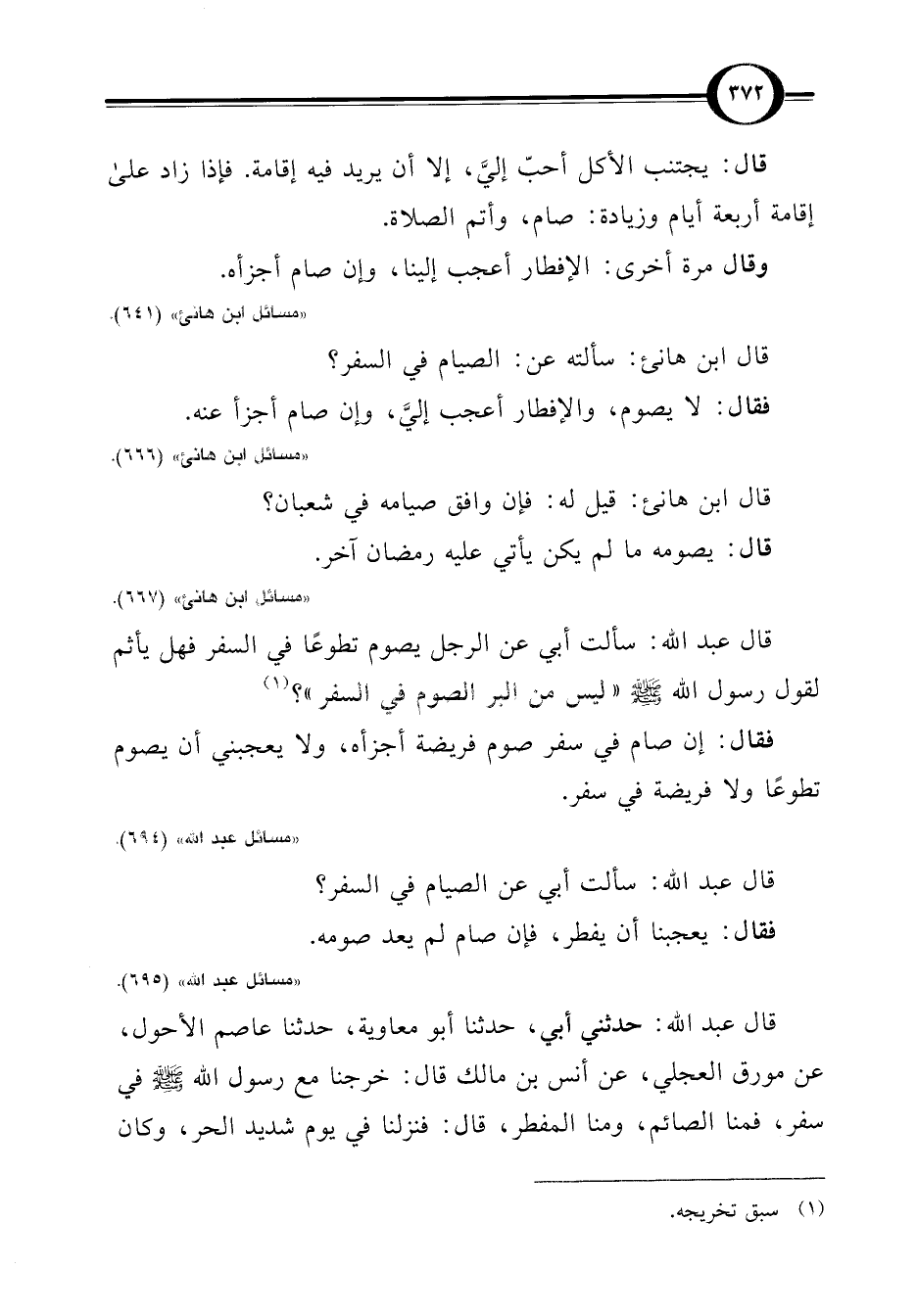 قال عبد اللَّه: سألت أبي عن الرجل يصوم تطوعًا في السفر فهل يأثم