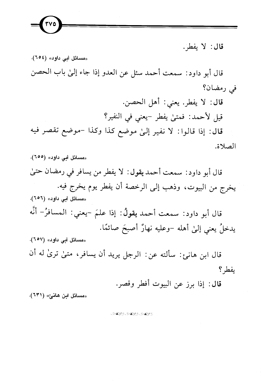 قال أبو داود: سمعت أحمد يقول: لا يفطر من يسافر في رمضان حتى يخرج من البيوت، وذهب إلى الرخصة أن يفطر يوم يخرج فيه.