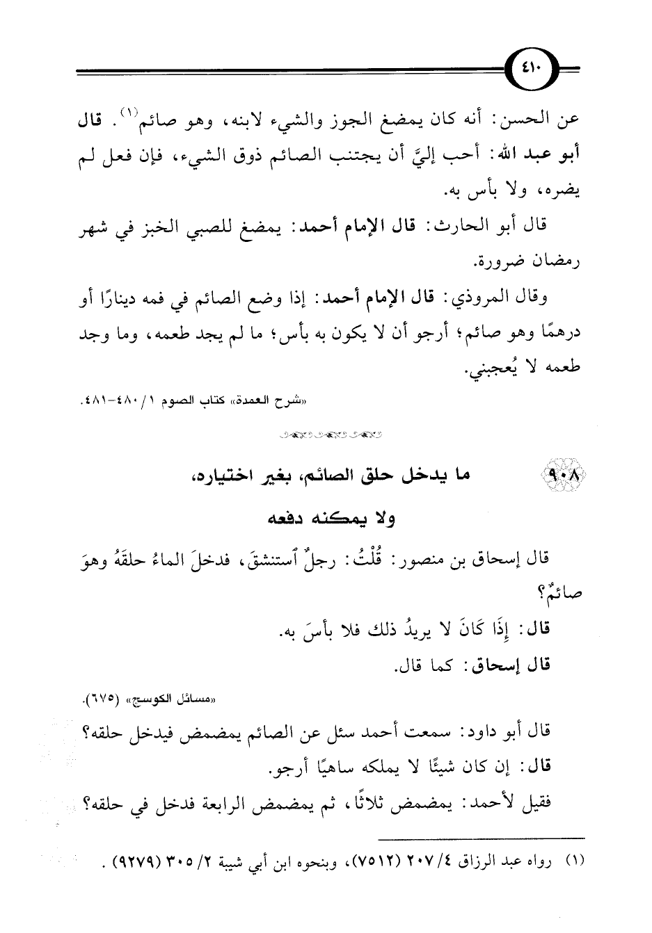 وقال المروذي: قال الإمام أحمد: إذا وضع الصائم في فمه دينارًا أو درهمًا وهو صائم؛ أرجو أن لا يكون به بأس؛ ما لم يجد طعمه، وما وجد طعمه لا يُعجبني.