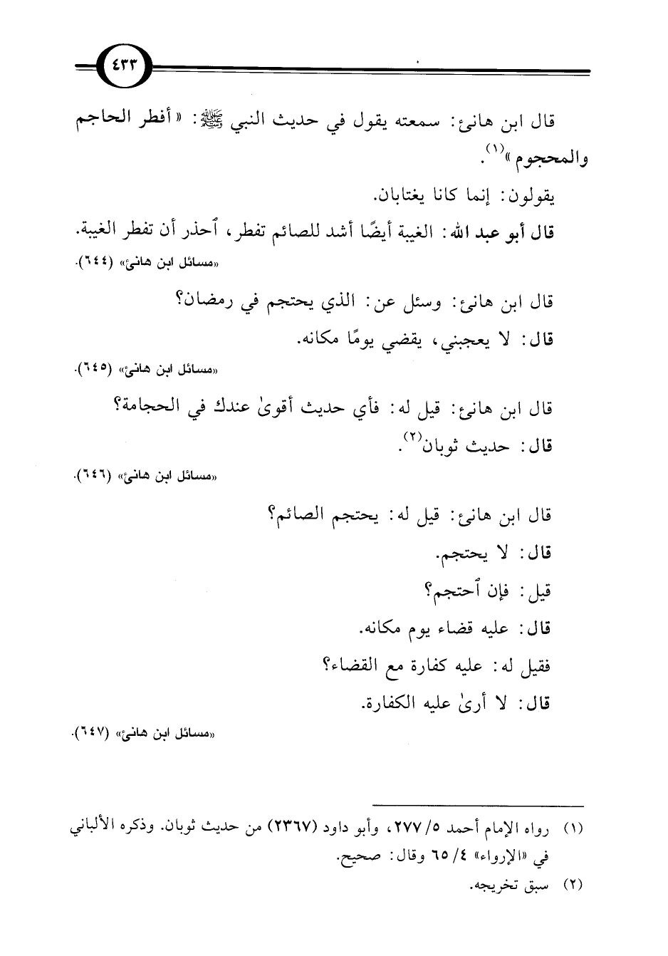 قال ابن هانئ: سمعته يقول في حديث النبي -صلى اللَّه عليه وسلم-: "أفطر الحاجم والمحجوم" (¬1).