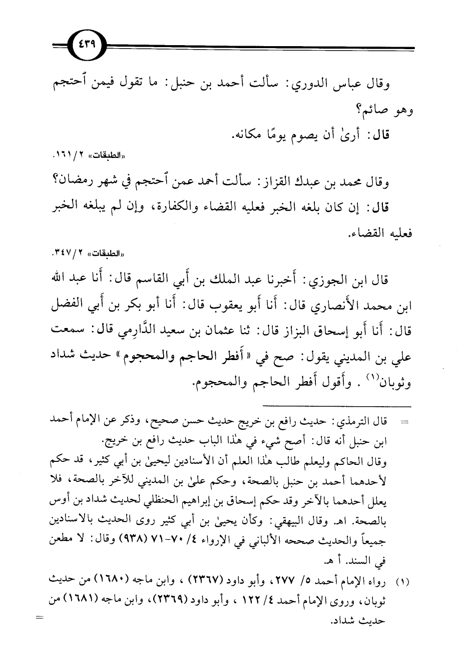 وقال عباس الدوري: سألت أحمد بن حنبل: ما تقول فيمن احتجم وهو صائم؟
