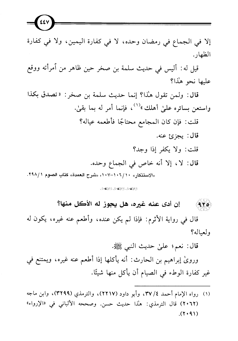 قيل له: أليس في حديث سلمة بن صخر حين ظاهر من امرأته ووقع عليها نحو هذا؟