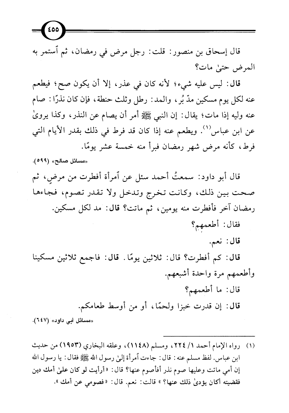قال إسحاق بن منصور: قلت: رجل مرض في رمضان، ثم استمر به المرض حتى مات؟
