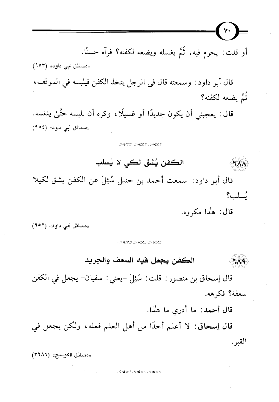 قال أبو داود: سمعت أحمد بن حنبل سُئِلَ عن الكفن يشق لكيلا يُسلب؟