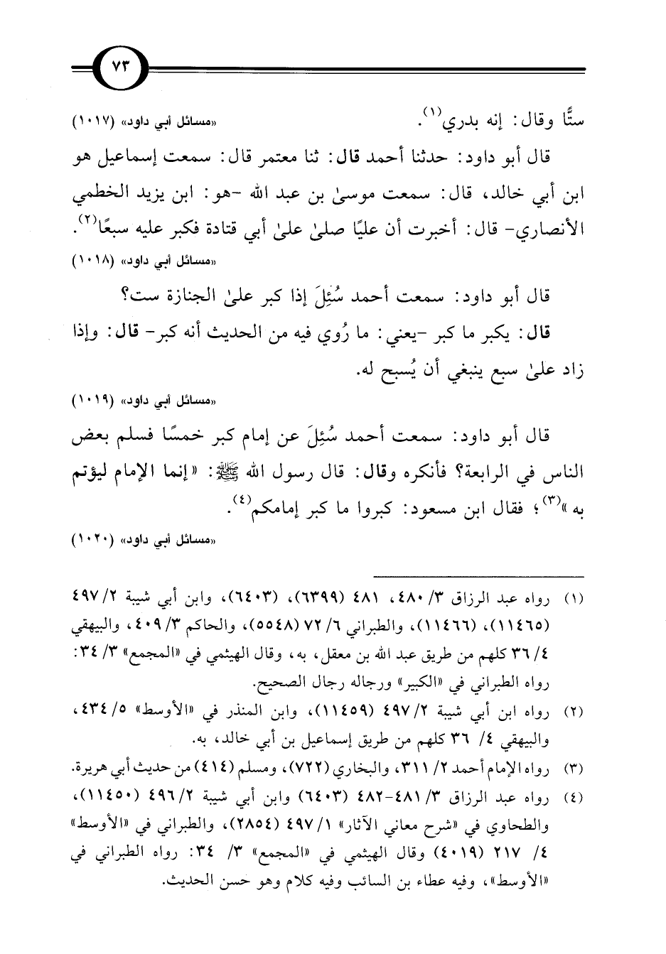 قال أبو داود: سمعت أحمد سُئلَ إذا كبر على الجنازة ست؟