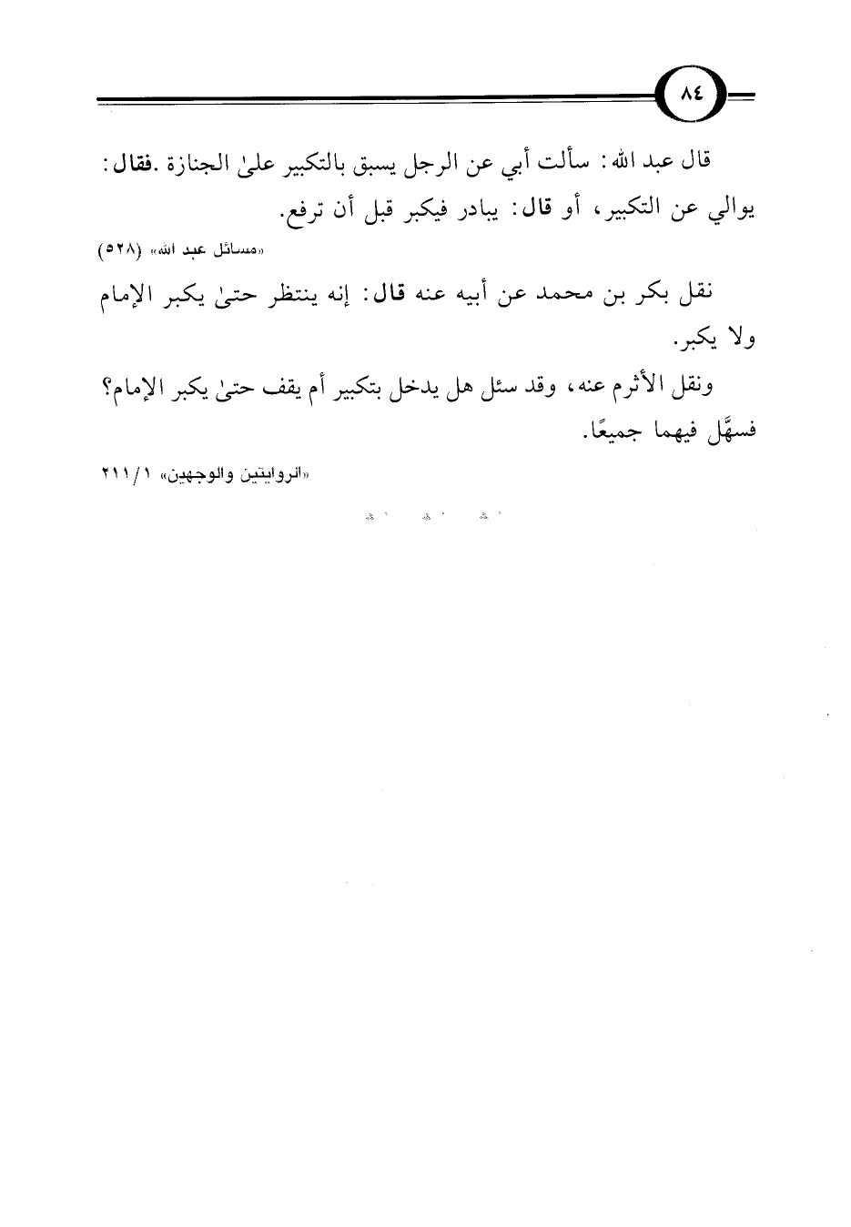 قال عبد اللَّه: سألت أبي عن الرجل يسبق بالتكبير على الجنازة. فقال: يوالي عن التكبير، أو قال: يبادر فيكبر قبل أن ترفع.