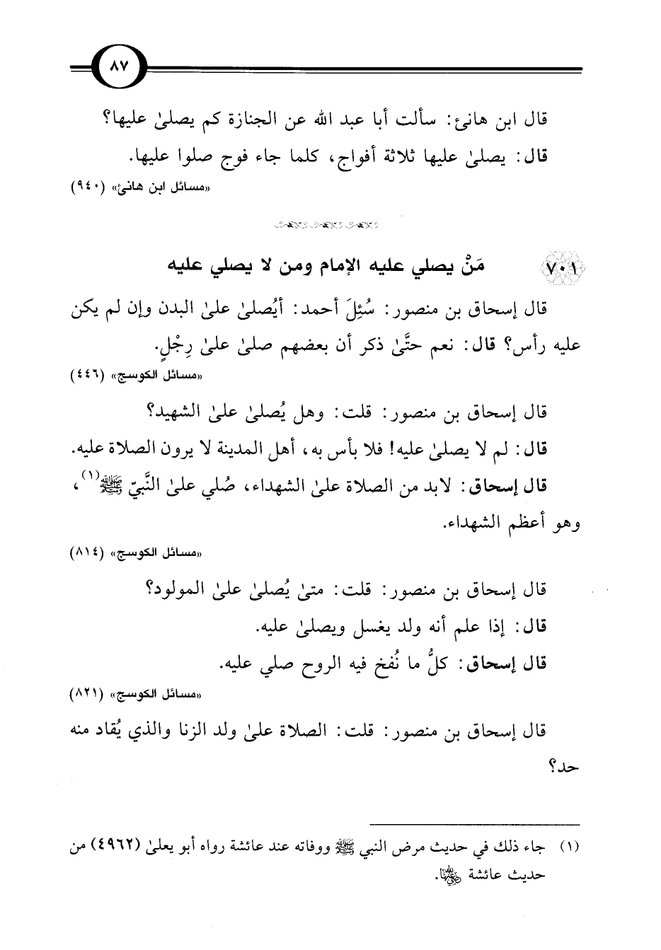 قال إسحاق بن منصور: قلت: وهل يُصلى على الشهيد؟